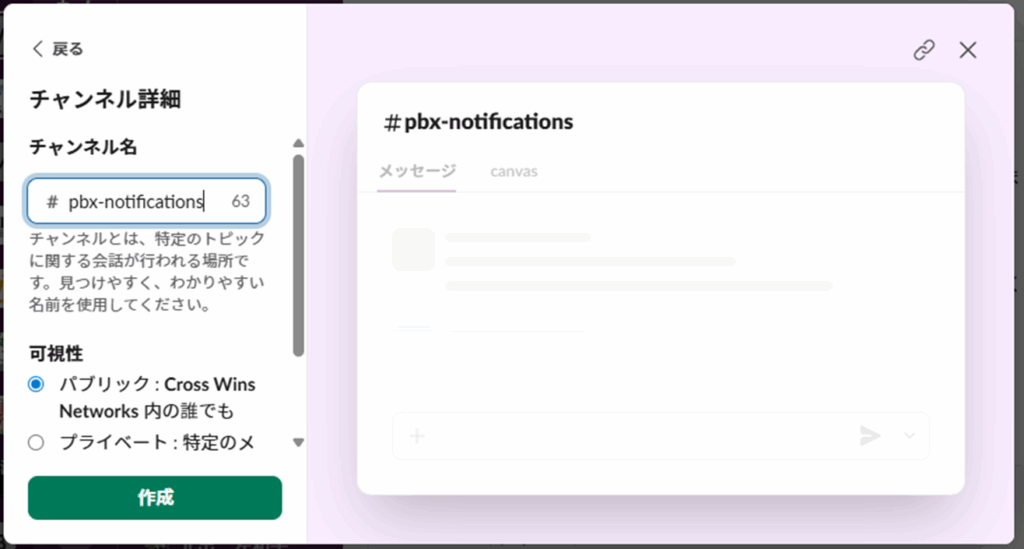 チャンネルの可視性やチャンネルに登録する人などは適宜設定してください。ここでは、「pbx-notifications」というチャンネルを作成しています。