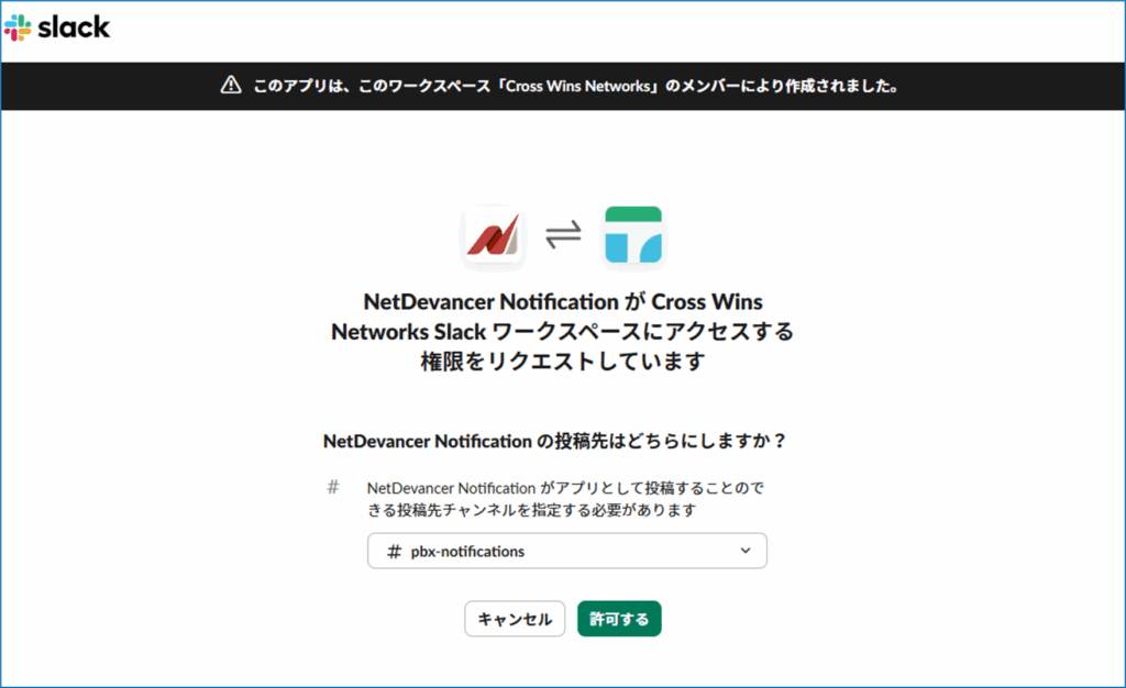 チャンネルを先ほど設定した「pbx-notifications」として選択し、「許可する」ボタン押すと、設定が完了し、前の画面に戻ります。