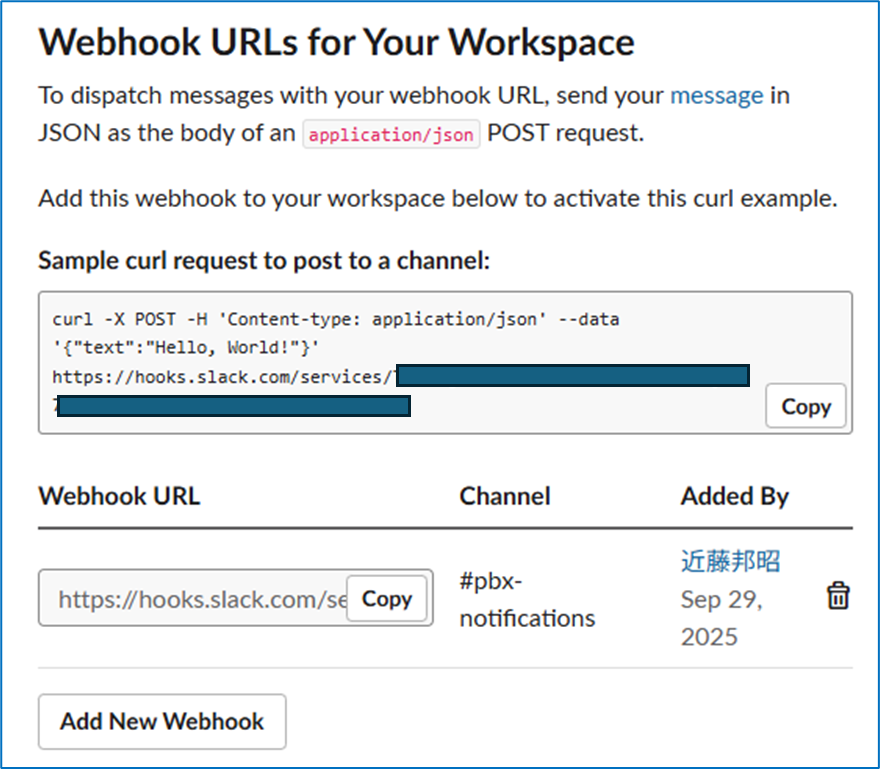 改めて「Webhook URLs for Your Workspace」を確認すると、新たにWebhook URLが作成されています。